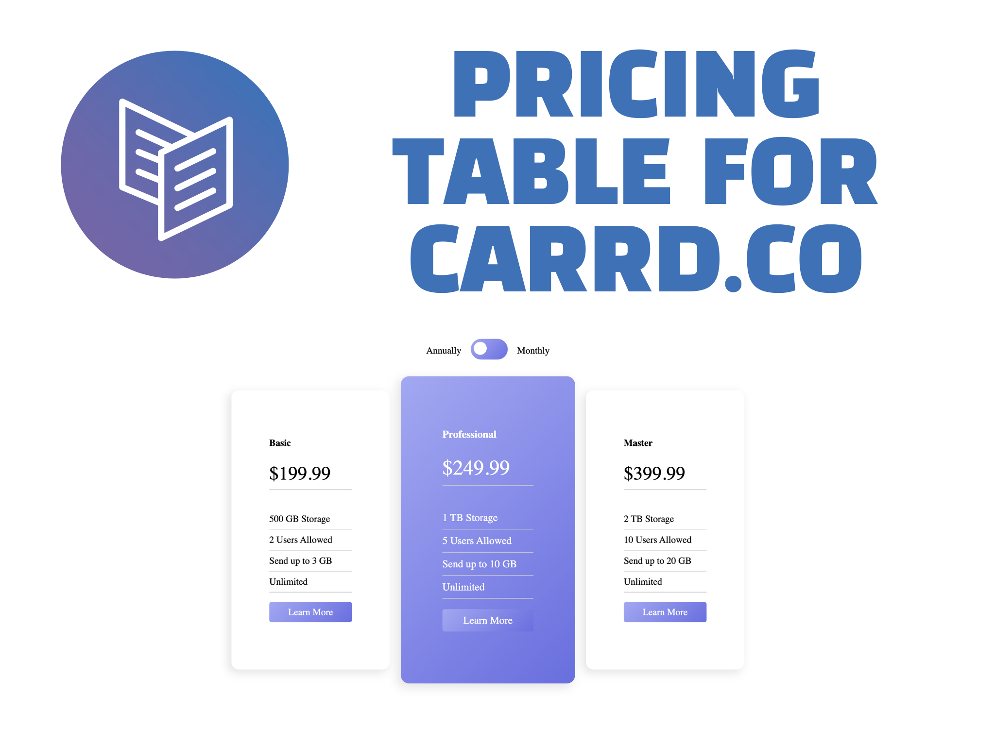 Enhance your Carrd website with our sleek and functional pricing table that is designed to adapt seamlessly to any screen size. With the year toggle feature, you can provide your visitors with flexible pricing options, allowing them to choose between monthly or yearly subscription plans.